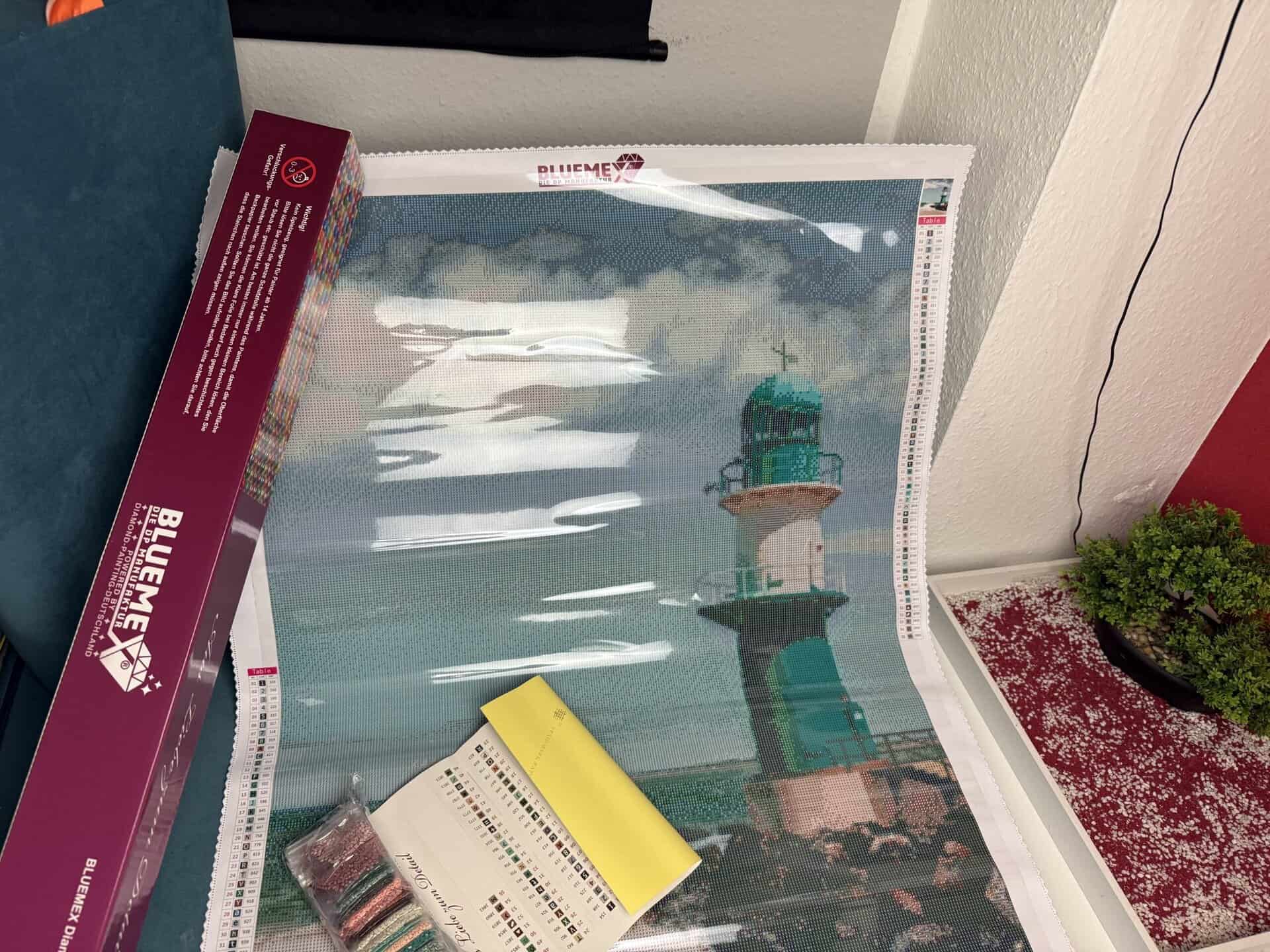 Für die einen wird es einem Nervenzusammenbruch gleichkommen, für mich ist es die beste Entspannung, die ich mir vorstellen kann. Ich hatte schon einmal ein Diamond Painting von der Firma Bluemex, aber das hatte ich irgendwie sehr schnell fertig. Dieses mal wollte ich es richtig wissen und auch mal einen Tag oder Wochen daran sitzen und habe mich für den Bluemex Diamond Painting Leuchtturm Warnemünde entschieden. Dieses Bild ist ganze 60×85cm groß und hat zudem 55 verschiedene Farben. Und auf geht’s!